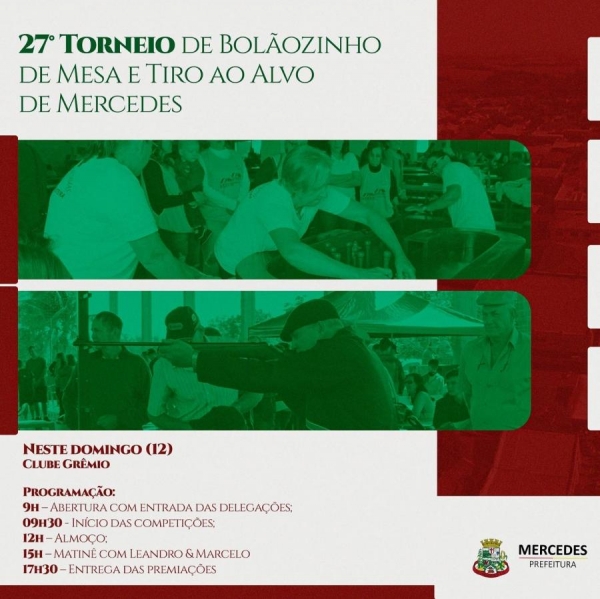 Os amantes do bolãozinho de mesa e tiro ao alvo têm um encontro marcado neste domingo (12), no Clube Grêmio, para o 27° Torneio de Bolãozinho de Mesa e Tiro ao Alvo de Mercedes. O evento promete uma programação repleta de diversão e competições para toda a família.