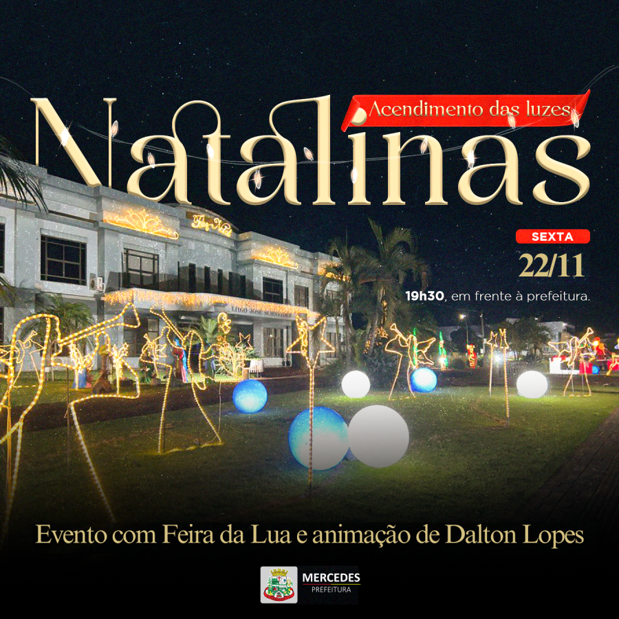 Nesta sexta-feira (22) Mercedes dará início às festividades natalinas com o acendimento das luzes em frente à Prefeitura, programado para às 19h30, juntamente com a tradicional Feira da Lua.