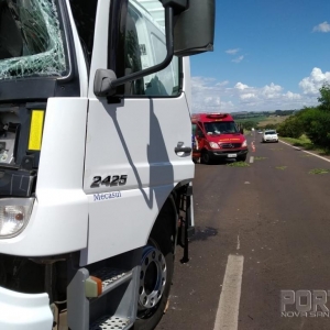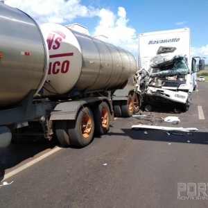 Já o outro caminhão que estava estacionado com problemas mecânicos no acostamento da rodovia teve poucas avarias.