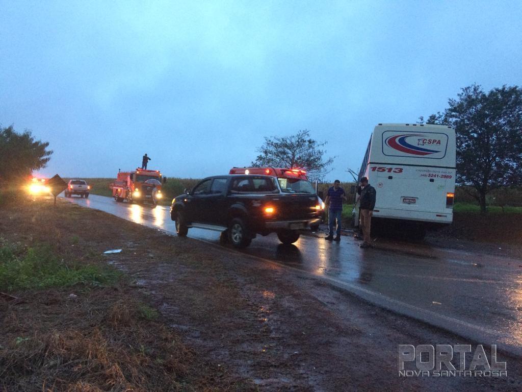 Um grave acidente de trânsito foi registrado por volta das 16h50 desta quinta-feira (23), na rodovia PR 239, trecho que liga Jesuítas a Iracema do Oeste, proximidades da comunidade do Água Preta. No acidente envolveu uma caminhoneta, conduzida por Sebastião de Souza Campos de 54 anos e um ônibus, de transporte de trabalhadores.