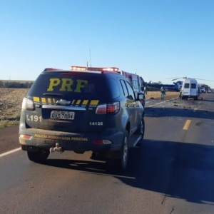 Neste momento uma equipe da Polícia Rodoviária Federal (PRF) e socorristas do SAMU atendem vítimas de acidente de trânsito na rodovia BR 163, entre Guaíra e Marechal Rondon.