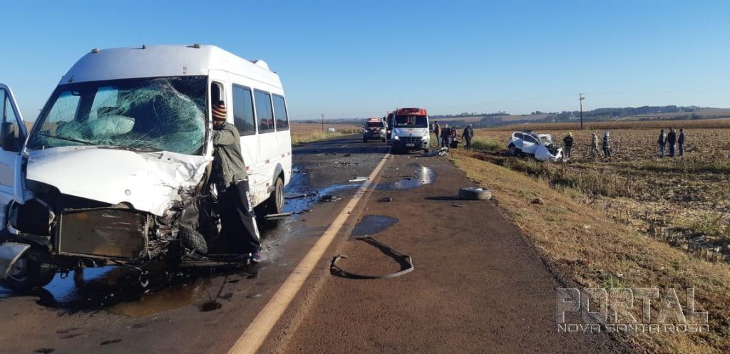 De acordo com a equipe da PRF que atende a ocorrência, o motorista da van fazia uma ultrapassagem em local permitido pela sinalização, mas acabou por atingir o carro que transitava no sentido contrário.