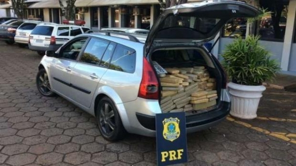 O veículo Megane, roubado em Cascavel e apreendido na BR 277, na manhã desta segunda-feira (26), foi trazido para a Delegacia da 15ª SDP carregado com maconha.