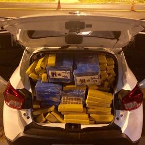 Após vistoriar o veículo, um Renault/Kwid, branco, licenciado em Londrina, em nome de uma locadora de veículos, foi localizado em seu interior e no porta-malas 479 tabletes de maconha pesando aproximadamente 318,00 kg (trezentos e dezoito quilos).