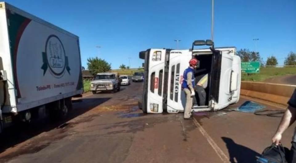 O motorista de um caminhão ficou ferido após o veículo tombar na PR 182, em Toledo, na tarde desta terça-feira (17). De acordo com a vítima, um dos pneus traseiros do veículo estourou e fez com o que veículo tombasse.