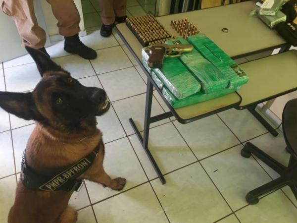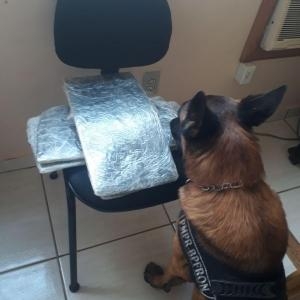 Ao realizar revista veicular o cão policial do Pelotão Operações com Cães indicou a presença de entorpecente em uma bagagem.