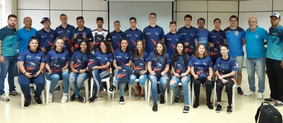 A entrega, realizada no auditório da Prefeitura, contemplou 06 atletas do handebol feminino, 04 do handebol masculino e 05 da modalidade de Ginástica Rítmica. Além do kit composto por uma 1 bolsa, 1 camiseta, 1 boné e uma garrafa, também foram pagos no decorrer do ano 6 parcelas de R$ 200,00 para cada atleta.