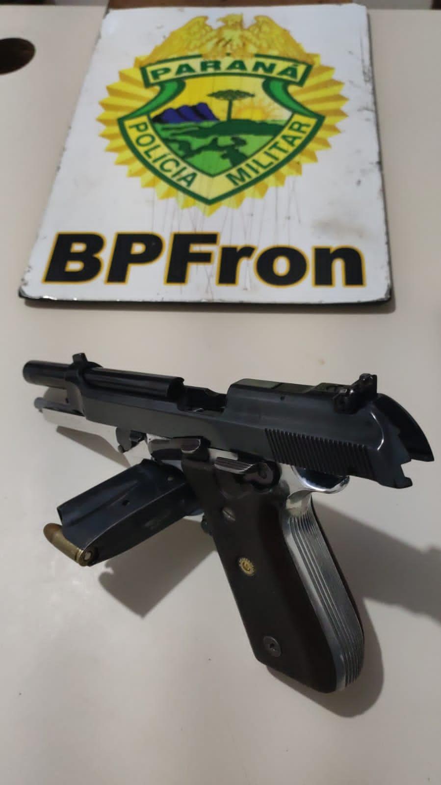 Em revista veicular foi encontrada uma pistola calibre 9 mm com nove munições.