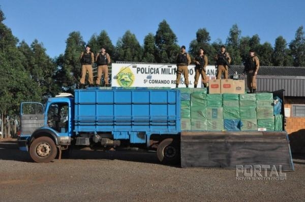 Na manhã de hoje, 22 de março de 2018, policias militares do BPFron - Batalhão de Polícia de Fronteira realivazam patrulhamento na PR 491 próximo ao distrito de Novo Três Passos quando avistaram um caminhão Mercedes. Foi dado voz de abordagem porém o motorista do caminhão ignorou a ordem de parada tomando sentido ao município de Nova Santa Rosa sendo que próximo a entrada desse município o motorista abandonou o caminhão em uma vegetação, empreendendo fuga, não sendo localizado pelos policiais militares. O caminhão estava carregado de caixas de cigarros contrabandeados do Paraguai. O caminhão bem como o contrabando apreendido serão encaminhados para a Receita Federal de Guaíra para os procedimentos legais cabíveis.