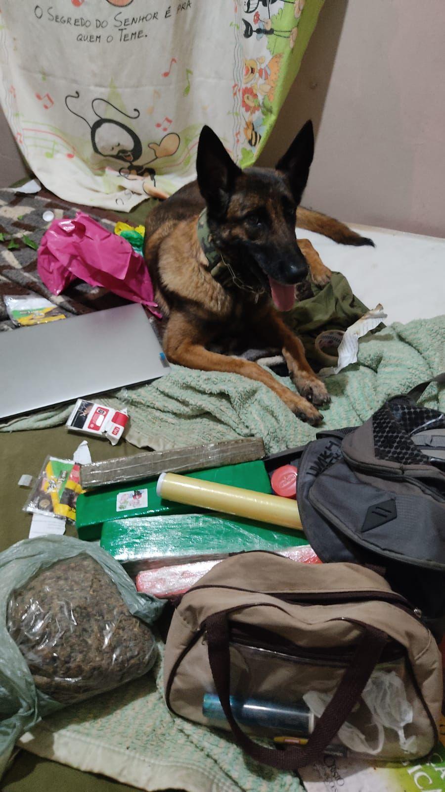 Os cães de faro do canil do BPFRON encontraram na residência duas mochilas, uma contendo drogas, uma arma de fogo e munições.