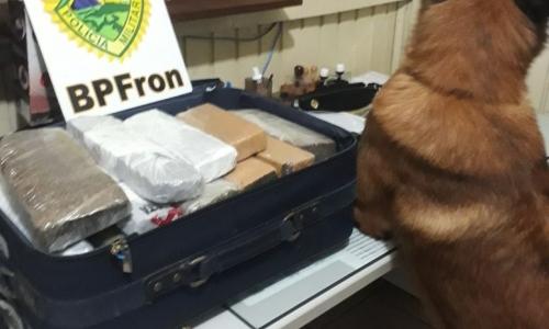 Na noite de ontem (20) policiais militares do BPFron - Batalhão de Polícia de Fronteira abordaram um ônibus no município de Realeza- PR com destino à Florianópolis - SC. Na abordagem foi empregado o cão farejador pertencente ao Canil do BPFron que localizou em uma bagagem de mão de uma passageira menor de idade 6 tabletes de substância análoga à maconha que após pesados totalizaram 1,93 kg do entorpecente. Diante dos fatos a passageira juntamente do entorpecente foram encaminhados para os procedimentos legais cabíveis. Mais tarde, em outra abordagem à ônibus, na madrugada de hoje, 21 Fev. 18, na cidade de Realeza - PR, foi abordado um ônibus com destino à Santa Maria - RS, também foi empregado o cão farejador do Canil do BPFron que obteve êxito ao indicar entorpecente em uma mala. Foram localizados 18 kg de substância análoga à maconha. A proprietária da bagagem foi presa e encaminhada juntamente do entorpecente para os procedimentos legais cabíveis.
