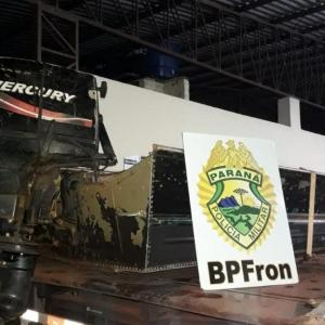 Os Policiais Militares do Pelotão C.O.B.R.A. do BPFron também realizaram apreensão nesta operação já na noite de terça - feira (19). Foi durante patrulhamento aquático no lago Itaipu no município de Mercedes - PR. Foi encontrado uma embarcação de 6 metros com motor Mercury 40hp abandonada em um porto clandestino sem nenhum sinal de identificação, tampouco número de inscrição. Realizado buscas no local, não foi localizado nenhum proprietário. Como é sabido na região de fronteira que este tipo de embarcação é utilizado para a prática do crime de contrabando, foi feito contato com a Delegacia Fluvial de Guaíra, da Marinha do Brasil para encaminhamento da embarcação apreendida.