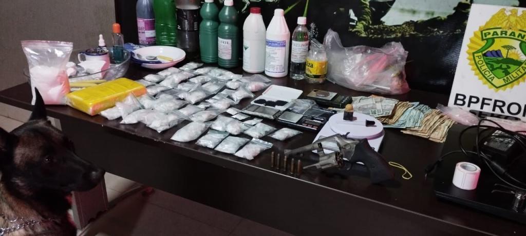 Na residência, a corporação encontrou um revólver calibre 38. Com ajuda dos cães farejadores, foram encontradas porções de cocaína, crack, balanças de precisão, produtos químicos para composição das drogas, pratos para manipulação dos entorpecentes, embalagens para confecção dos produtos, galões e um notebook.