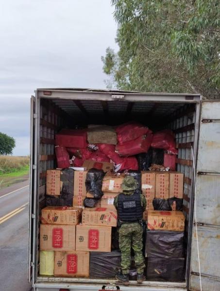 Dois caminhões, um trator com uma carreta acoplada e mais de cem mil pacotes de cigarros contrabandeados foram apreendidos em Francisco Alves neste domingo (10).