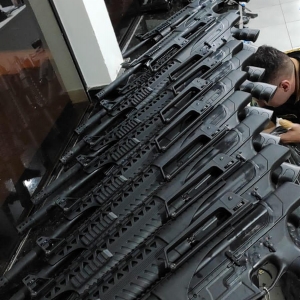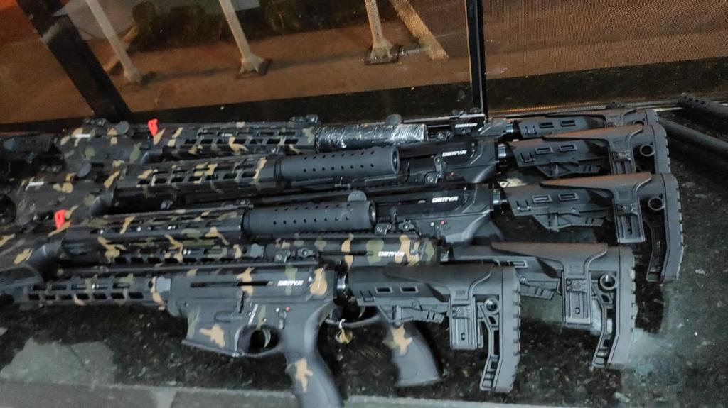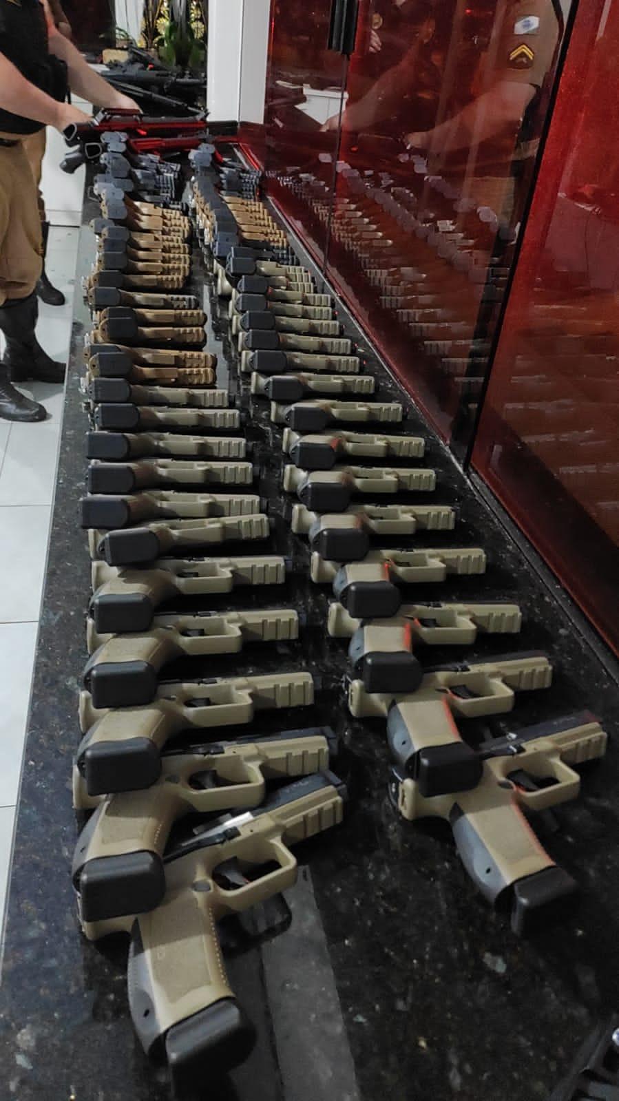 Em um dos veículos foram localizadas 93 armas de fogo, sendo 69 pistolas, 3 fuzis e 21 espingardas calibre GA12, sendo que uma destas pistolas estava municiada e carregada para uso pessoal.