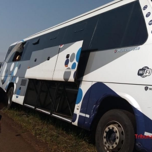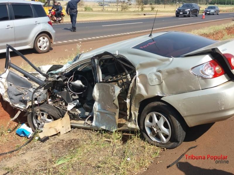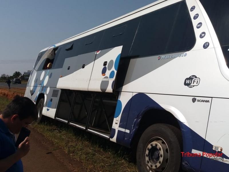 No local foi constatada a colisão envolvendo um ônibus Marcopolo da Empresa Canindeyu, de placas paraguaias e o veículo Toyota / Corolla, de cor prata, de placas do Mercosul DHO-8G02.
