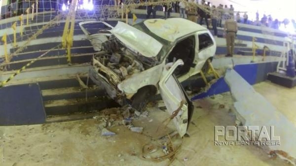 Nas imagens, o Gol passa na rua ao lado do ginásio, quando populares ouvem o estrondo da batida no ginásio e correm para ver o que aconteceu.