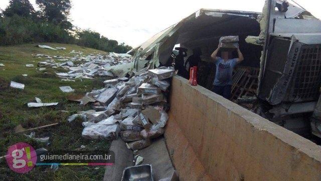 Um caminhão carregado de frangos acabou tombando na rodovia BR 277, próximo ao Castelinho no município de Matelândia.