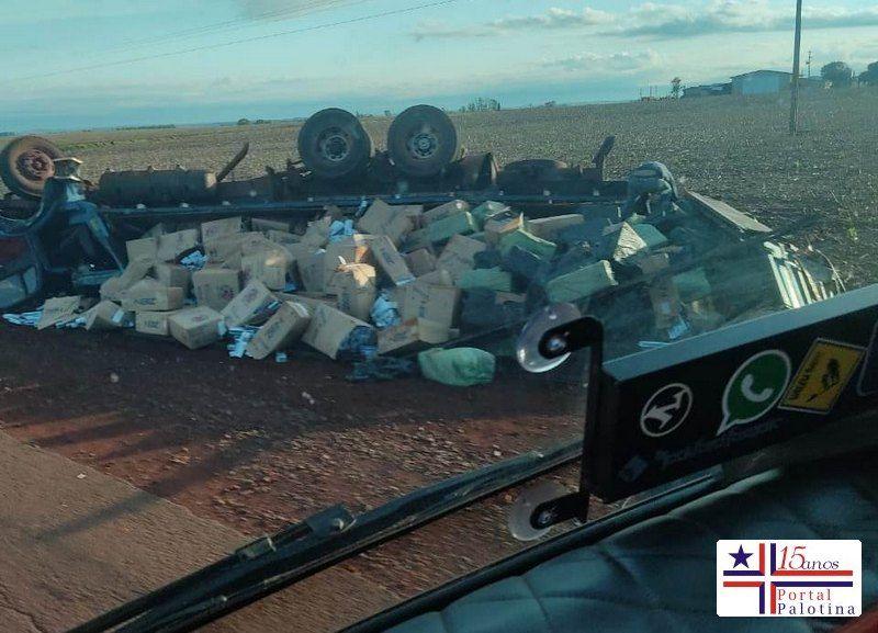 Um caminhão carregado com cigarros tombou nesta terça-feira(19) na região da Vila Nice.