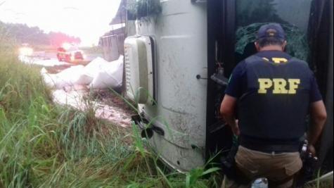Segundo a PRF (Polícia Rodoviária Federal), o caminhão tombou na altura do quilômetro 470. A carga de fertilizantes ficou espalhada pela pista.