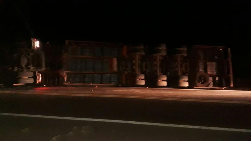 De acordo com a Polícia Rodoviária Estadual (PRE), o motorista, que estava sozinho no caminhão, perdeu o controle do veículo em uma curva. O homem não sofreu ferimentos.