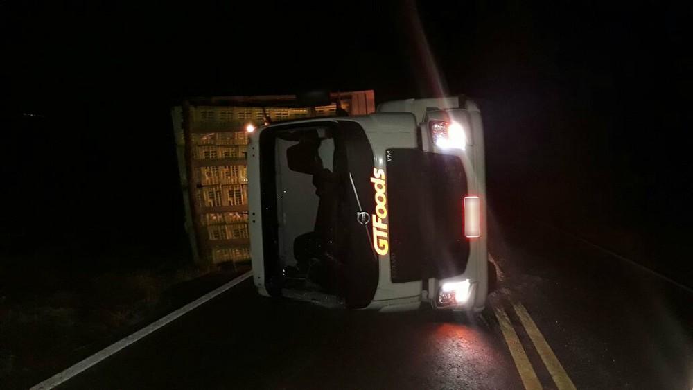 Um caminhão carregado com frangos vivos tombou na PR-498, entre Floraí e São Carlos do Ivaí, no noroeste do Paraná. O acidente aconteceu na madrugada desta sexta-feira (11).