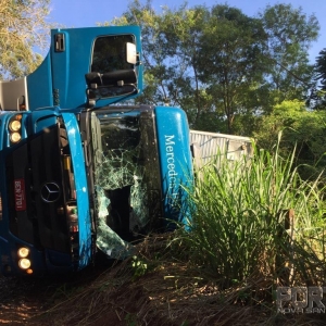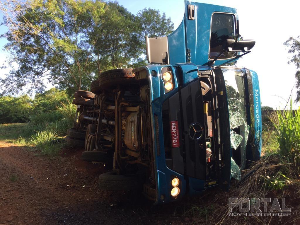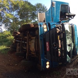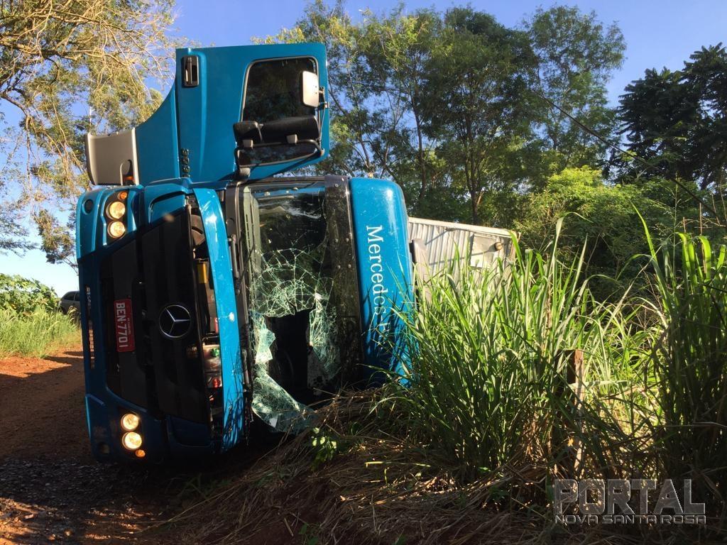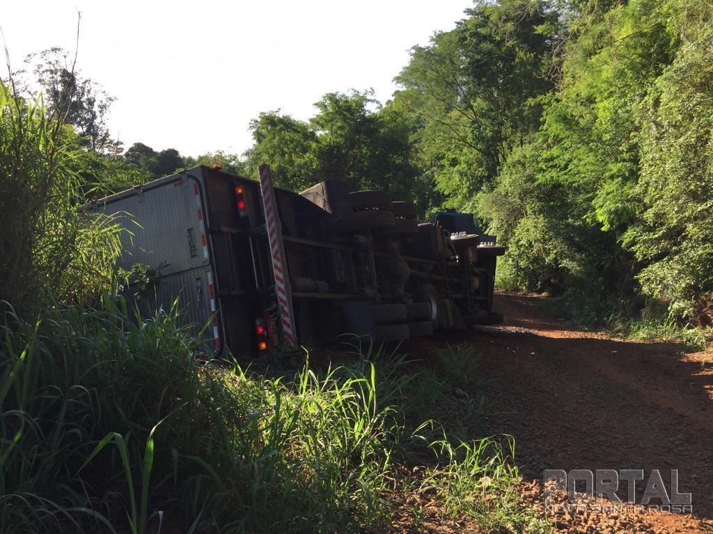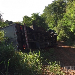 Um caminhão Mercedes Benz com placas de Cascavel tombou após perseguição com a Polícia Federal na manhã desta segunda-feira (18), nas proximidades da ponte do Rio Guaçu, divisa de Marechal Rondon e Nova Santa Rosa.