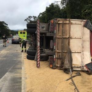 Um caminhão carregado com soja tombou na BR-277 em São José dos Pinhais, na Região Metropolitana de Curitiba, nesta quarta-feira (9). Ninguém ficou ferido, segundo a PRF, o caminhão Volvo tem placas de Nova Santa Rosa.