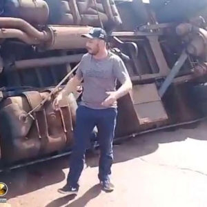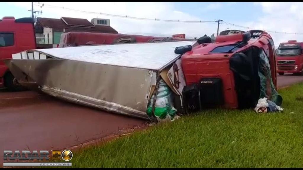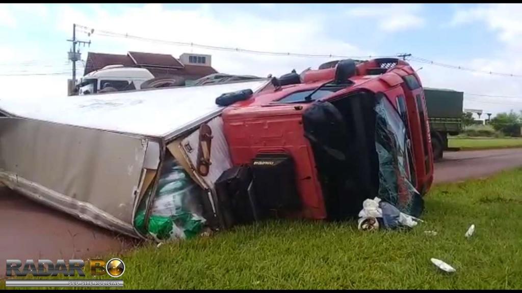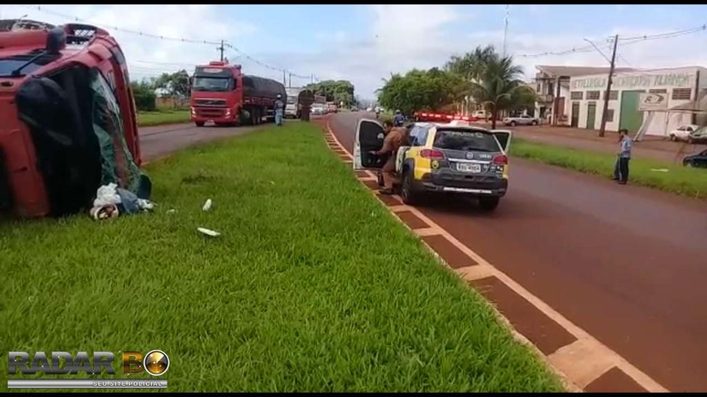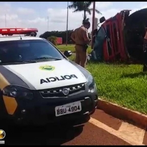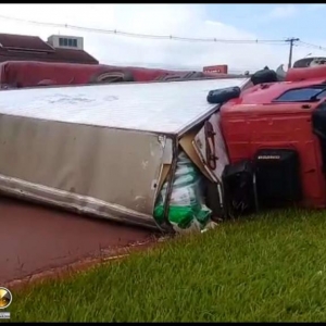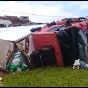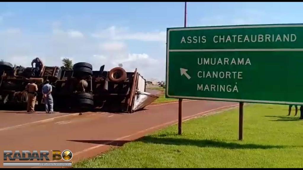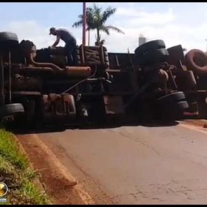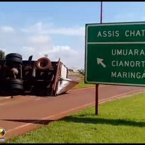 Um caminhão Volvo com placas de Toledo tombou na manhã desta quinta-feira (21), no trevo de acesso a Avenida Tupãssi em Assis Chateaubriand e saída para Toledo. Segundo informações no local, o motorista seguia no trecho Toledo a Assis Chateaubriand, sendo que sentiu que o caminhão começou a balancear e logo na sequência, perdeu o controle e tombou o mesmo, resultando em ferimentos leves. Ao tombar o veículo, foi constatado que o cardan do mesmo veio a quebrar. Uma equipe do SAMU de Assis foi acionada e prestou os primeiros atendimentos para o rapaz, que recusou encaminhamento ao hospital. Uma equipe da Polícia Militar controlou o trânsito no local até a chegada da Polícia Rodoviária Estadual. O caminhão teve danos materiais de grande monta, sendo que um pouco de óleo vazou após o tombamento.