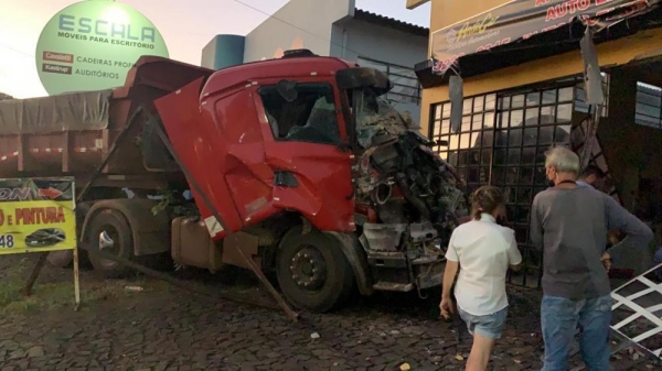 Danos de elevada monta foram registrados tanto na cabine do caminhão quanto na fachada da empresa. Ninguém ficou ferido.