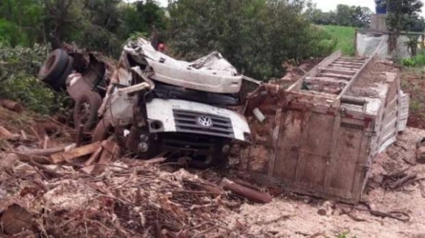 Caminhão fica destruído em tombamento na PR 493, em Itapejara do Oeste