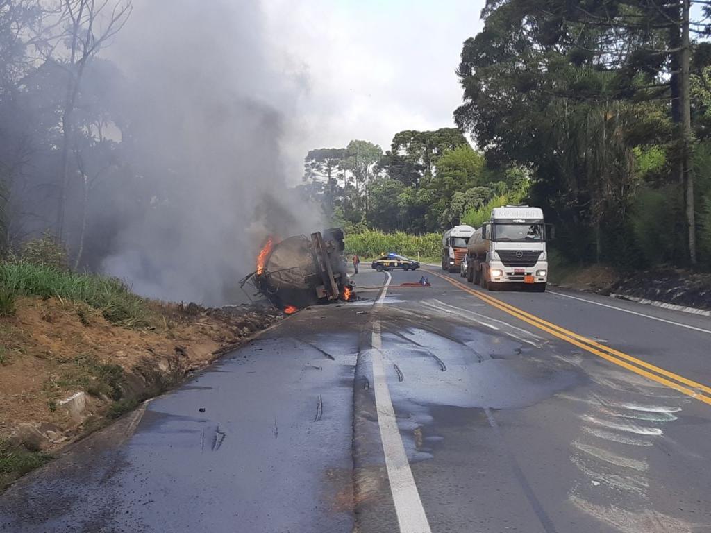 Um trecho da BR-476, em São Mateus do Sul, no sul do Paraná, está com o trânsito lento na manhã desta sexta-feira (20) devido ao tombamento de um caminhão-tanque carregado com óleo diesel.