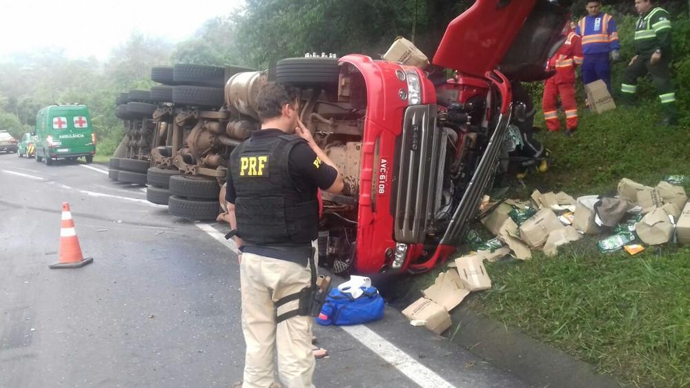 Segundo a PRF, o caminhão, que carregava um contêiner de frios, trafegava em direção a Curitiba quando perdeu o controle em uma curva e virou.