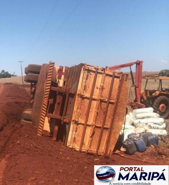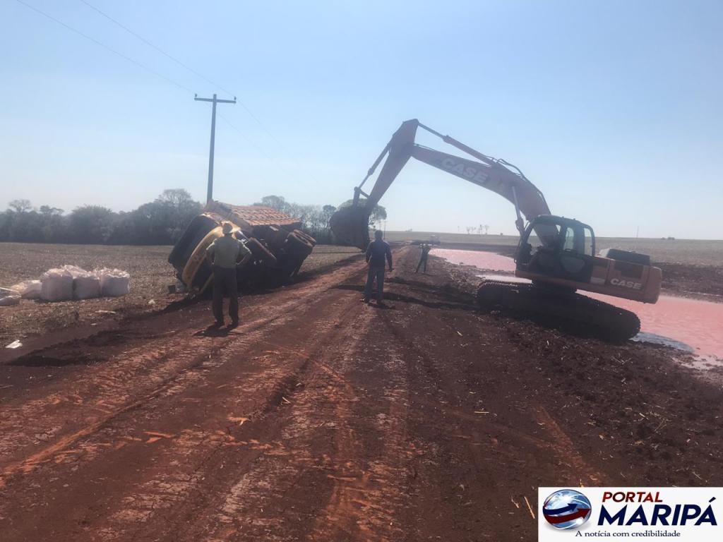 Segundo informações, o caminhão carregado de adubos e sementes para o plantio da safra verão, transitava pela estrada rural quando em dado momento tombou devido ao solo ainda não compactado e úmido, há pouco tempo a estrada passou por uma readequação.