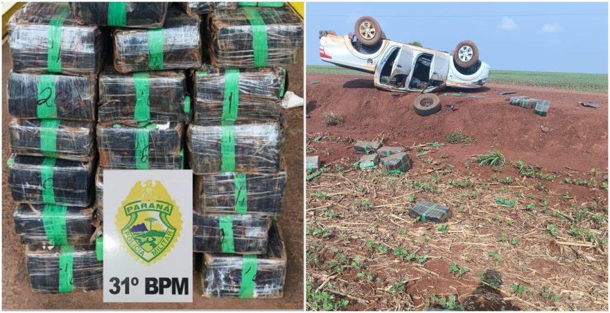 A equipe Rádio Patrulha da PM deslocou onde estava o veículo capotado, o condutor já tinha se evadido, o veículo estava carregado com maconha e posterior pesado a droga totalizou 430kg.