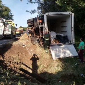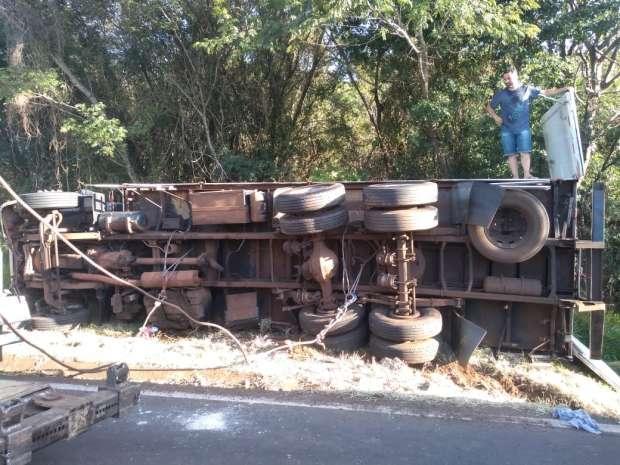 Segundo informações repassadas pela Polícia Rodoviária Federal de Laranjeiras do Sul, a carreta com placas de Medianeira, perdeu o controle da direção e tombou na rodovia.
