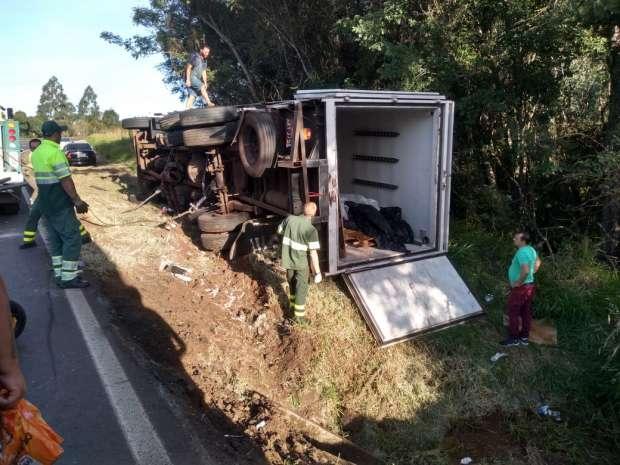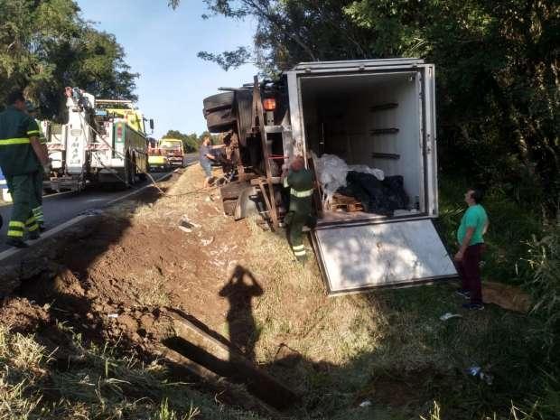 A carreta carregada com carne tombou no KM 405,5 da BR 277, em Candói, na manhã desta quinta-feira (13).