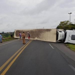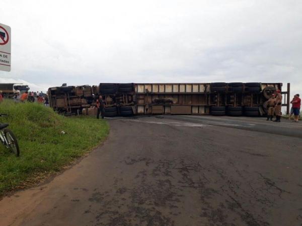 Na manhã deste domingo (18) uma carreta com placas de Várzea Grande, carregada de carnes tombou no trevo de acesso a Wenceslau Braz, na PR-092. A carreta ficou atravessada na pista interditando a rodovia em ambos os sentidos.