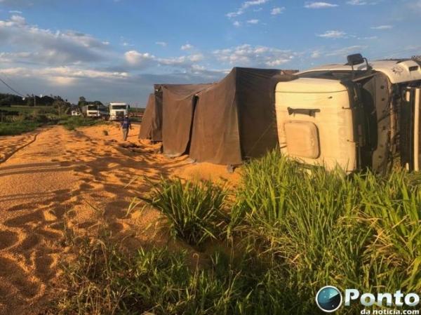 Uma carreta Scania bitrem carregada de milho tombou na tarde desta terça-feira (04) na BR-163 a cerca de 3 km de Guaíra, na saída para Mercedes.