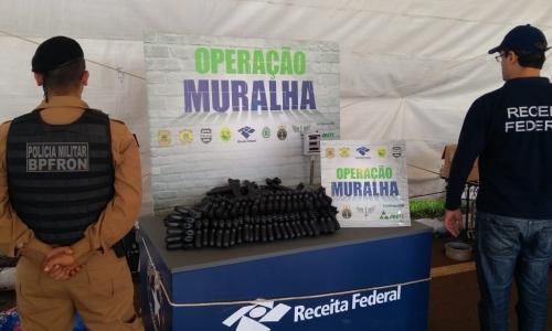 No último final de semana, no âmbito da Operação Muralha, na barreira de fiscalização anexa ao pedágio de São Miguel do Iguaçu, ação conjunta entre servidores da Receita Federal e policiais do BPFron e da Polícia Federal resultou na apreensão de uma carreta com cigarros e um carro com simulacros de arma de fogo. A primeira ocorrência foi no sábado (23) às 13h, quando uma equipe de fiscalização recebeu informações de um carro que estava abandonado em uma estrada rural próxima a barreira de fiscalização. A equipe se deslocou para o local, onde foi encontrado, em meio a uma plantação de milho, um carro com placas de Missal/PR. No interior do veículo havia diversos pacotes contendo aproximadamente 70 simulacros de armas de fogo. Diante o fato, o veículo foi guinchado até a barreira da Operação Muralha e, na sequência, encaminhado para a Delegacia da Polícia Federal para os procedimentos cabíveis. Já no domingo, por volta da 10h, foi abordada uma carreta que aparentemente estava carregada com farinha de trigo. Segundo motorista, um homem de 43 anos, a mercadoria havia sido abastecida em Santa Terezinha de Itaipu/PR e teria como destino São Paulo/SP. Após uma breve inspeção, ficou evidente que havia algo além da carga de trigo. Desta forma, o motorista acabou confessando que, oculto em meio à carga, havia uma grande quantidade de cigarros originários do Paraguai. Diante os fatos, o caminhão foi encaminhado até a Alfandega da Receita Federal em Foz do Iguaçu/PR, onde a mercadoria foi contada em 95 mil maços de cigarro e avaliada em R$475 mil. O condutor recebeu voz de prisão em flagrante pelo crime de contrabando e foi conduzido para a Delegacia da Polícia Federal. A Operação Muralha, desenvolvida na região de Foz do Iguaçu, iniciou sua primeira fase no ano em 30/04/18. As ações estão sendo desenvolvidas na barreira fixa montada próxima ao pedágio de São Miguel do Iguaçu/PR, com revezamento de equipes nas 24h do dia, e nas estradas vicinais, lago do reservatório de Itaipu e Rio Paraná através de incursões das equipes volantes de prontidão. Essa iniciativa está inserida no âmbito do Programa de Proteção Integrada de Fronteiras (PPIF), instituído pelo Decreto nº 8.903/2016, tem como diretrizes a atuação integrada e coordenada dos órgãos de segurança e de fiscalizações atuantes nas fronteiras, e como foco, o fortalecimento da prevenção, do controle, da fiscalização e da repressão aos delitos transfronteiriços, como contrabando, descaminho, tráfico de drogas, armas e medicamentos, entre outros. Participam da Operação a Receita Federal, Polícia Federal, Polícia Rodoviária Federal, Exército, Marinha, Força Aérea Brasileira, Polícia Militar do Paraná, Polícia Civil, Departamento de Inteligência do Estado do Paraná, GGIFRON-PR, ANTT, IBAMA, Ministério Público do Paraná.