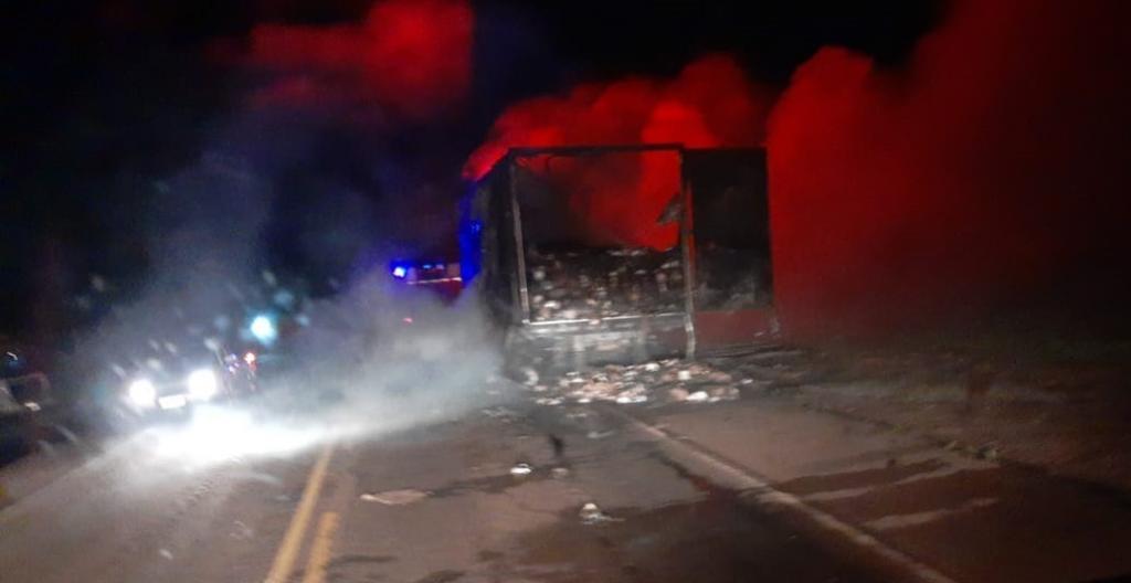 O Corpo de Bombeiros foi acionado as 21h19, para deslocar até o km 285, onde constataram que a carreta baú, câmara fria, estava sendo consumida pelo fogo e na sequencia combatido.