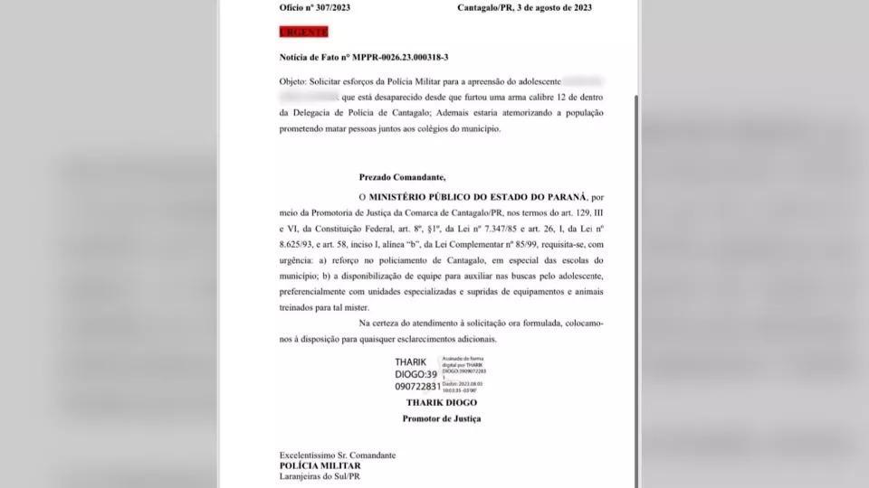No ofício do Ministério Público do Paraná afirma-se que um adolescente furtou uma arma calibre 12 da Delegacia de Polícia de Cantagalo.