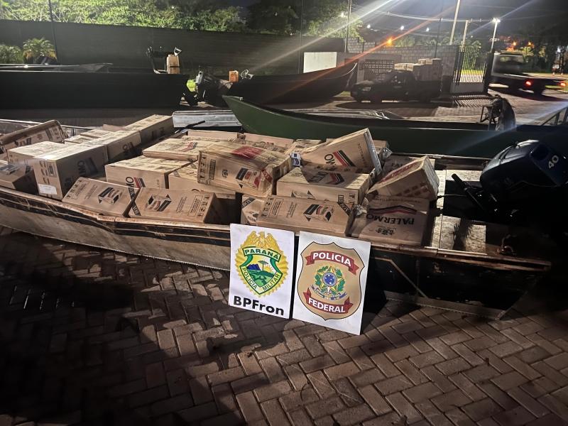 Na noite do último domingo (21), policiais federais e militares do BPFRON, em uma ação conjunta no âmbito da Operação Argos, apreenderam uma embarcação com aproximadamente 140 caixas de cigarros contrabandeados do Paraguai durante patrulhamento embarcado no Lago de Itaipu, na cidade de Mercedes-PR.