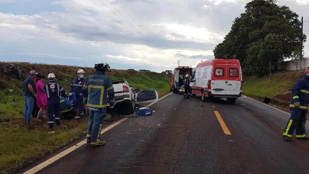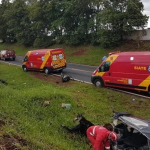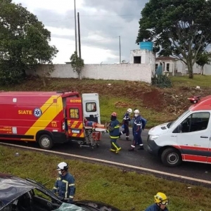 Equipes do Siate e do Samu foram acionadas em uma colisão entre dois veículos na PR-180, no Distrito de Rio do Salto, em Cascavel, na tarde desta sexta-feira (29).