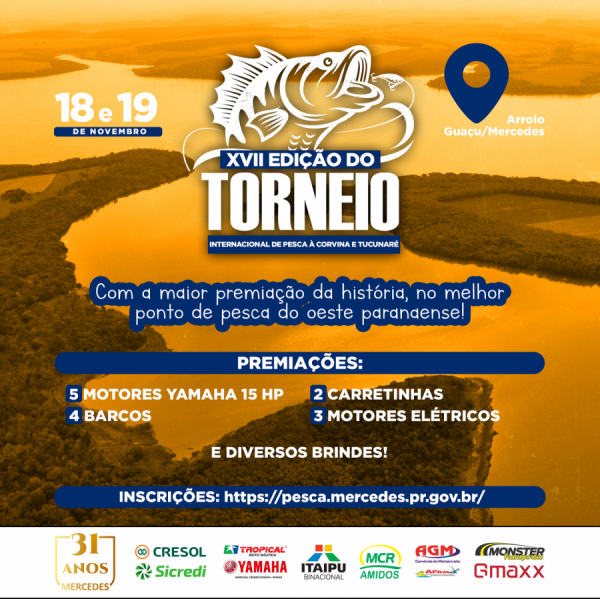 A Administração de Mercedes realizará nos dias 18 e 19 de novembro, a XVII Edição do Torneio Internacional de Pesca à Corvina e Tucunaré, no Distrito de Arroio Guaçu, considerado o melhor ponto de pesca do oeste paranaense. O destaque deste ano é a premiação recorde de mais de R$ 120 mil.