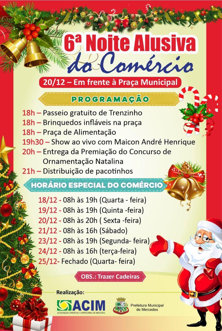 A administração municipal e a Associação Comercial e Empresarial de Mercedes (Acim) organizaram uma série de atrações para a "6ª Noite Alusiva ao Comércio", marcada para esta sexta-feira (20), a partir das 20h, na praça central.