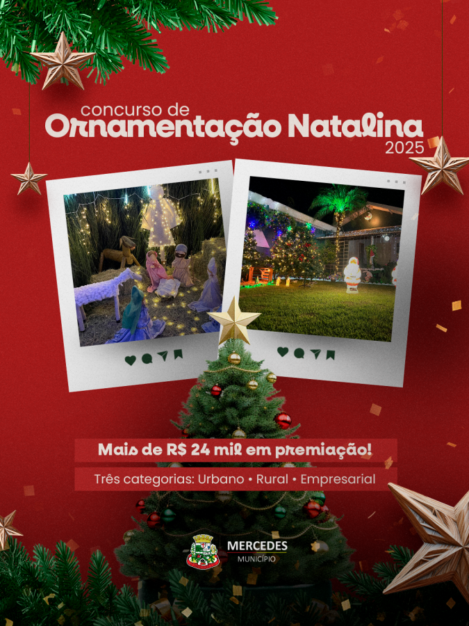 Com o objetivo de fortalecer o espírito natalino no município e incentivar moradores e empresários a decorarem casas e estabelecimentos, a Prefeitura de Mercedes abriu as inscrições para o Concurso de Ornamentação Natalina, que neste ano terá mais de R$ 24 mil em premiação — um valor ampliado em relação às edições anteriores.