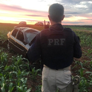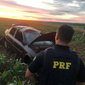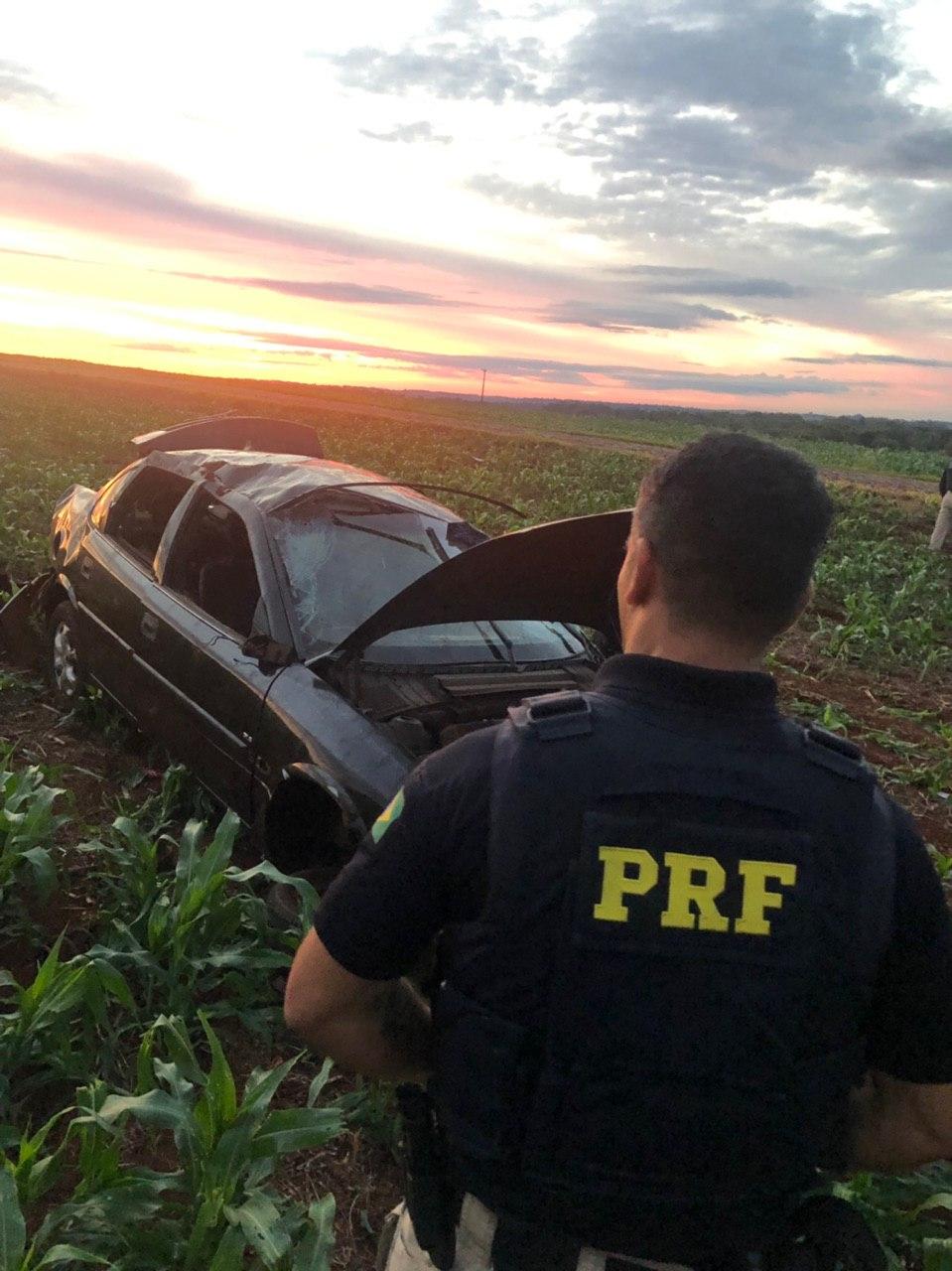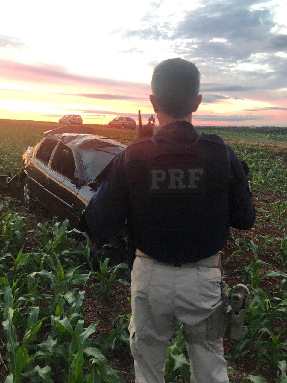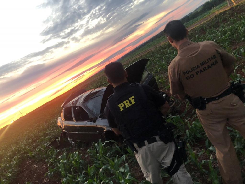 Em determinado momento, durante o acompanhamento o condutor do veículo ao passar sobre um queba molas perdeu o controle de direção saindo da pista e capotando em meio a uma plantação.
