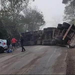 O condutor da carreta sofreu ferimentos leves. O bitrem tombou atravessado sobre a rodovia, e a pista foi interditada.