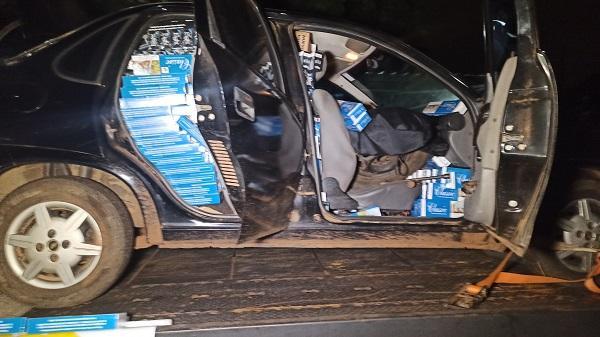 No carro foram localizados 28 caixas de cigarros contrabandeados.
